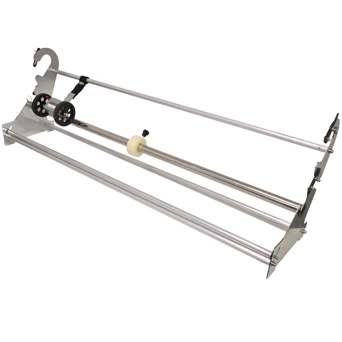 The TapeTech EMESHDISPENSE Mesh and Building Wrap Dispenser quickly and easily attaches to scaffolding and swing stages to safely hold rolls of EIFS and Stucco mesh or building wraps. The metered dispenser mechanism allows you to accurately roll out the precise length of material needed, eliminating guesswork and significantly reducing waste due to overcuts. Ratched roller design elimnates backroll. The EMESHDISPENSE can help to increase safety by preventing loose rolls of mesh from falling over on scaffolds and stages and places the roll at a more ergonomic working height, eliminating the need for workers to bend to roll and cut mesh or wrap on the jobsite. Features quick and easy roll replacement and adjustable end stops for uniform dispensing of various width materials. The TapeTech EMESHDISPENSE holds rolls up to 43" wide.
